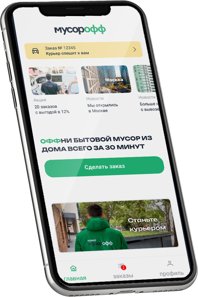 Чтобы заказать вынос мусора, скачайте приложение "МусорОФФ" на ваш смартфон, выберите объем, укажите адрес и передайте мешок курьеру или выставьте мешок за дверь после того, как откроете домофон, далее мы все сделаем за Вас.
